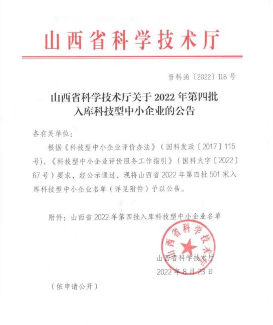 根據(jù)《科技型中小企業(yè)評(píng)價(jià)辦法》(國科發(fā)政[2017]115號(hào))、《科技型中小企業(yè)評(píng)價(jià)服務(wù)工作指引》(國科火字[2022]67號(hào))要求,經(jīng)公示通過,我公司入庫2022年第四批科技型中小企業(yè)。