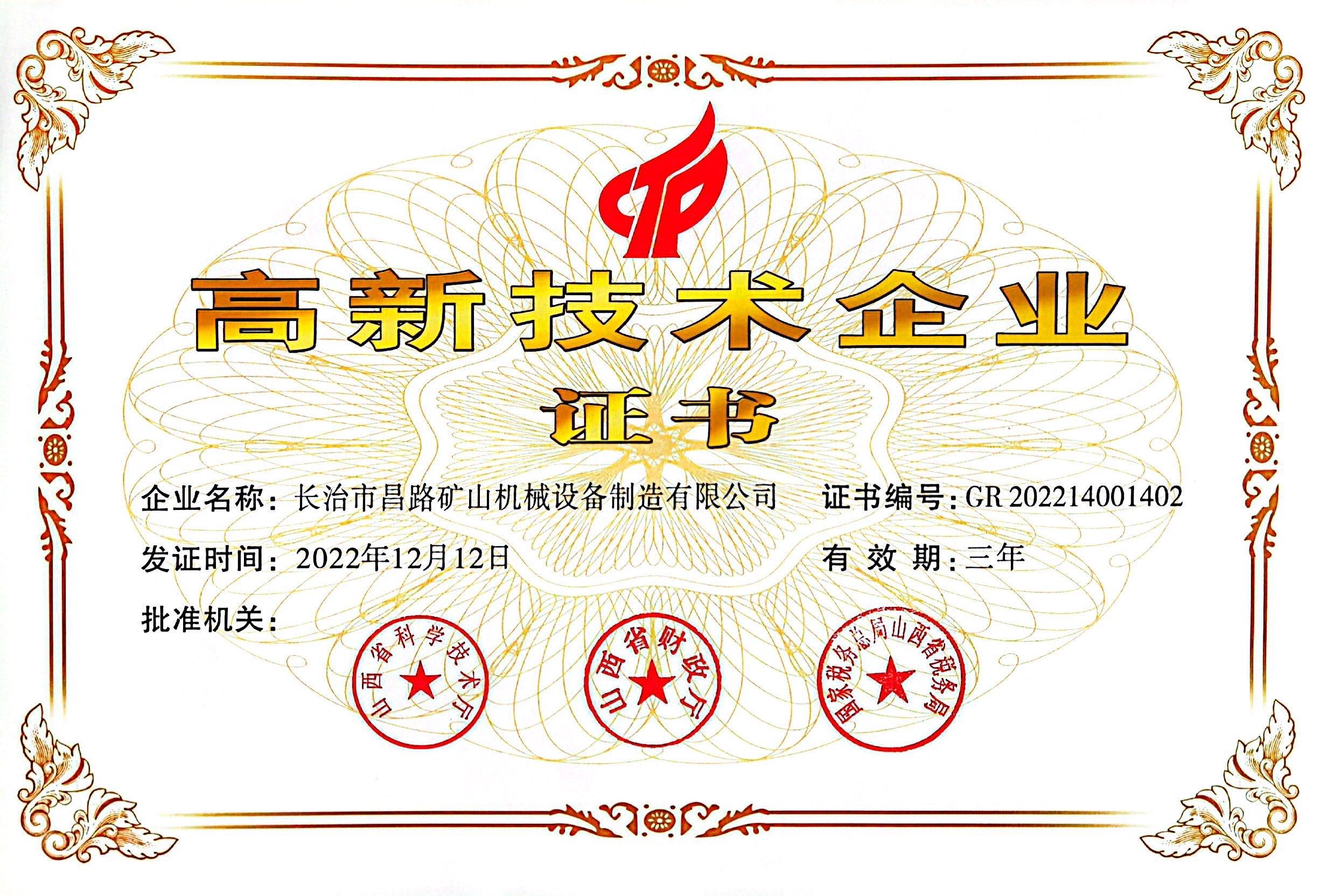 高新技術企業(yè)證書